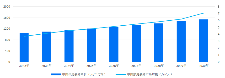 美好生活研究中心测算,当前中国家装行业规模已发展到4万亿规模,在中性立场下,这一数字在2025年将会达到4.78,到2030年,将进一步增长到7。