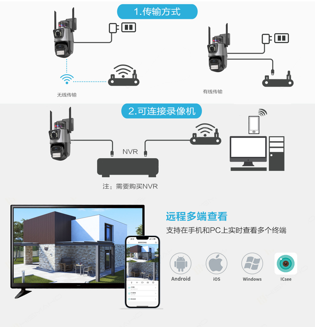 双镜头无线wifi监控摄像头双目联动防水全景360度户外枪球一体