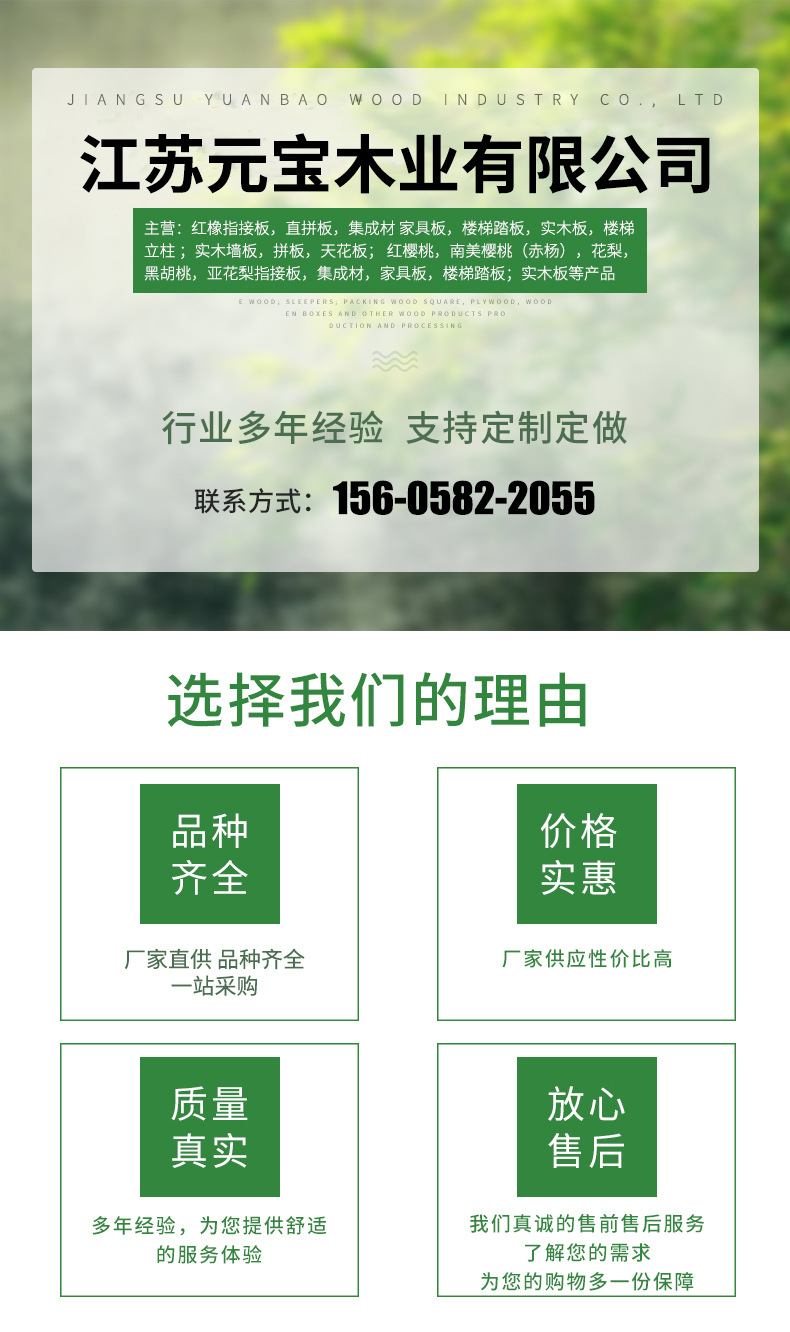 江苏元宝木业有限公司一直以“质优生产、服务专业、顾客满意”为经营宗旨,以“求仁为大、求利为小、真正服务为客户”为经营理念,开拓进取,务实创新,在做好经营的基础上,还以打造地方特色品牌为己任。在多年的经营中,坚持“培养高素质员工,不断优化生产技术,用品质和服务让客户回头”的经营原则;实行品质为先、快速加工,依靠专业能力获取公平回报的经营策略。坚持快速销售、合理定价,要求销售人员与客户心对心联络、面对面交流。同时,公司坚持规范经营,不追求高利润率,坚守价值底线、拒绝利益诱惑,坚持以专业能力从市场获取公平回报,是获得成功的基石。欢迎各界朋友莅临参观、指导和业务洽谈。