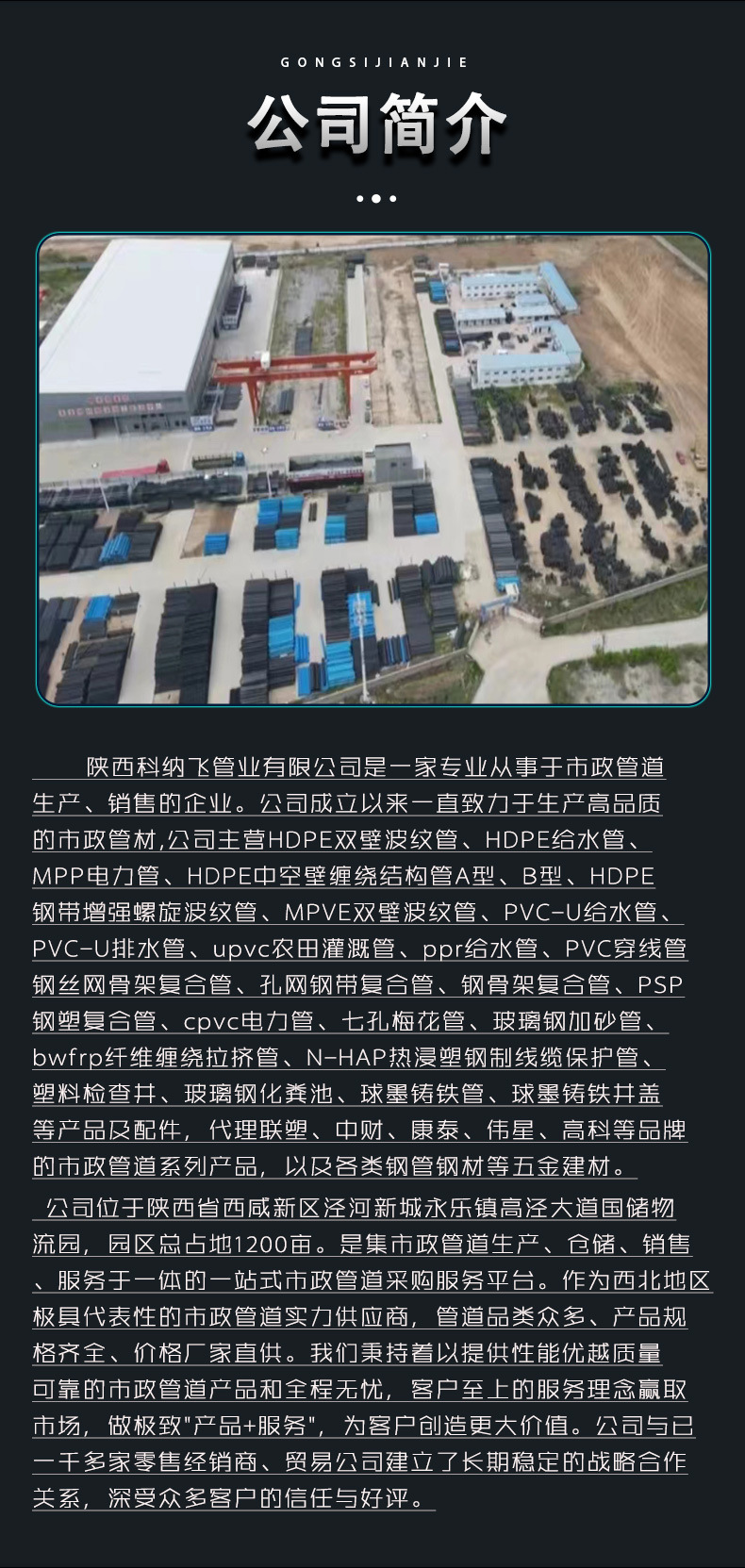 | 主营产品或服务 | HDPE给水管; HDPE双壁波纹管; 地暖管; 穿线管; 塑料检查井 | ||